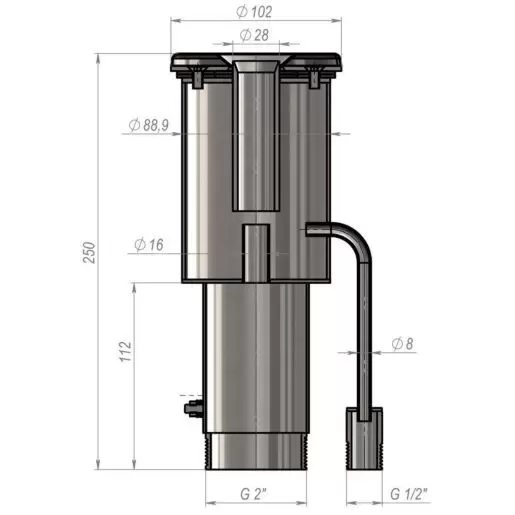Форсунка выполнена из нержавеющей стали марки AISI 304, устойчивой к коррозии, воздействию УФ-излучения, дезинфицирующих средств. Может монтироваться в дно и стены чаши бассейна.