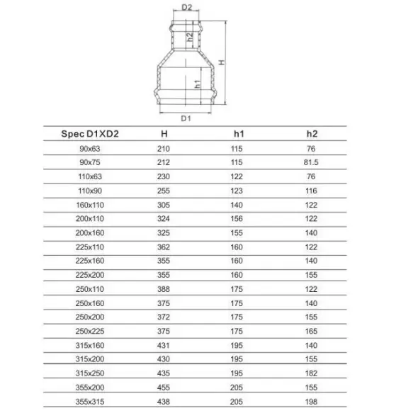 Патрубок переходной двухраструбный 225*110 мм под уплотнительное кольцо. Диаметр: 225х110 мм.Материал: ПВХ