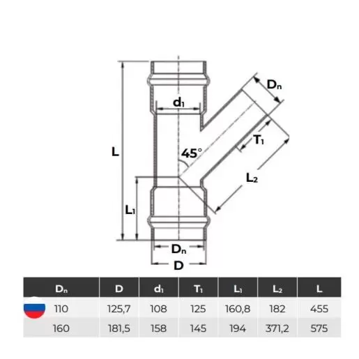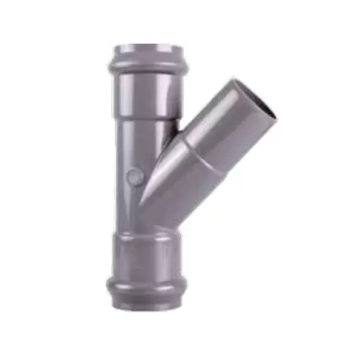 Раструбный тройник 45° под уплотнительное кольцо ПВХ Aquaviva из высококачественного ПВХ. Пр-во Россия. Изделия из ПВХ оптимальны для транспортировки жидкостей от 1 до 60°C под давлением и могут использоваться в системах водоснабжения и водоподготовки. Повышенная устойчивость к химии и окислению.