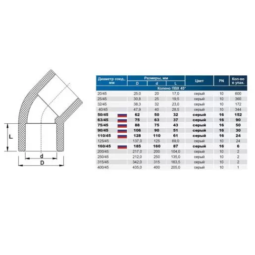 Отвод клеевой AquaViva 45° из высококачественного ПВХ. Пр-во Россия. Изделия из ПВХ оптимальны для транспортировки жидкостей от 1 до 60°C под давлением и могут использоваться в системах водоснабжения и водоподготовки. Повышенная устойчивость к химии и окислению. Цена указана за одну единицу.