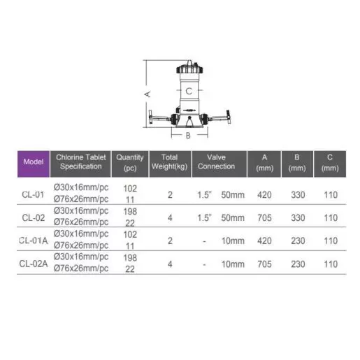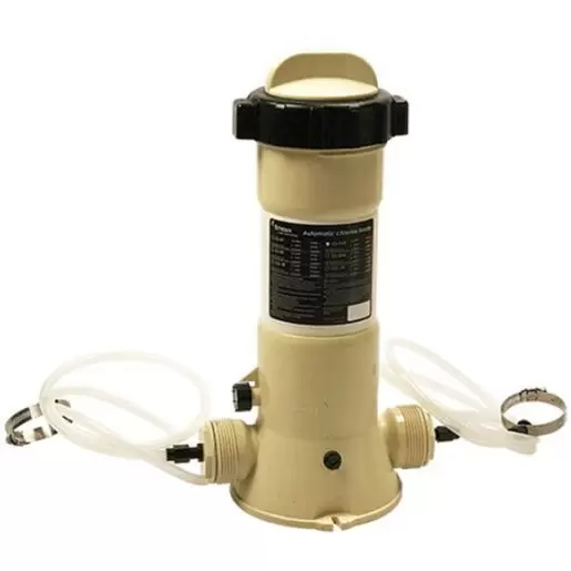 Хлоратор-полуавтомат Aquaviva (байпас) предназначен для дозации хлора или брома, используемого для обработки воды частных и коммерческих бассейнов. Установка включается в линию системы циркуляции бассейна через байпас. Является проточной емкостью для загрузки медленно растворимых гранул и таблеток на основе хлора или брома. Вода, попадая в диффузор создает раствор, который поступает в воду. Модель оснащена регулятором подачи хлорного раствора.